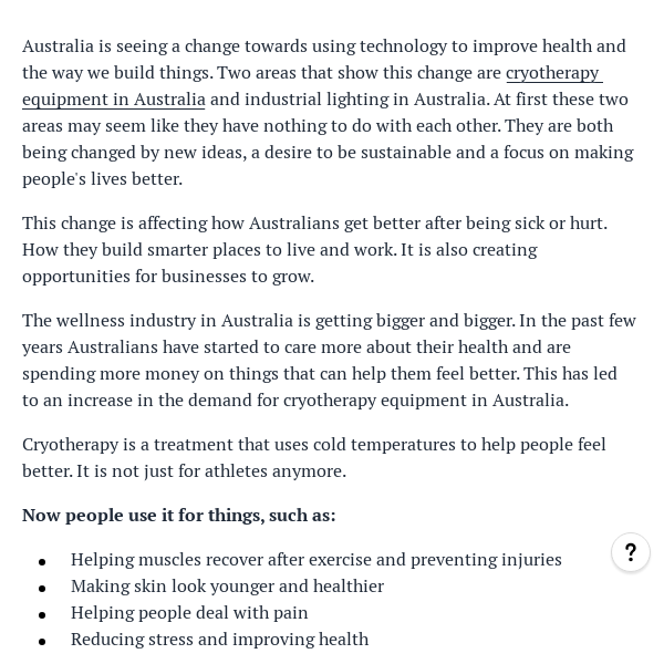 This blog highlights how Australia is using technology to improve health and infrastructure, focusing on cryotherapy and smart industrial lighting. It shows how both industries support well-being, efficiency, and sustainability while creating new business opportunities.